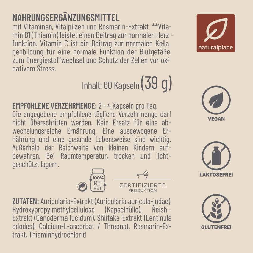 Auricularia-Extrakt (Auricularia auriculajudae), Hydroxypropylmethylcellulose (Kapselhülle), Reishi-Extrakt (Ganoderma lucidum), Shiitake-Extrakt (Lentinula edodes), Calcium-Lascorbat / Threonat (Ester-C®), Rosmarin-Extrakt, Thiaminhydrochlorid
